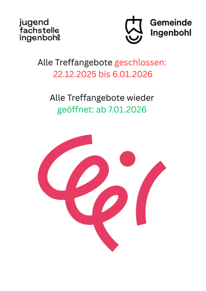 Das Jugendbüro am Donnerstag entfällt, da hier fast nie Besucher und Besucherinnen gekommen sind. Wer Beratung wünscht oder ein Projekt starten will, kann eine Zeit von Mittwoch bis Freitag mit dem Team der Jugendfachstellt vereinbaren.